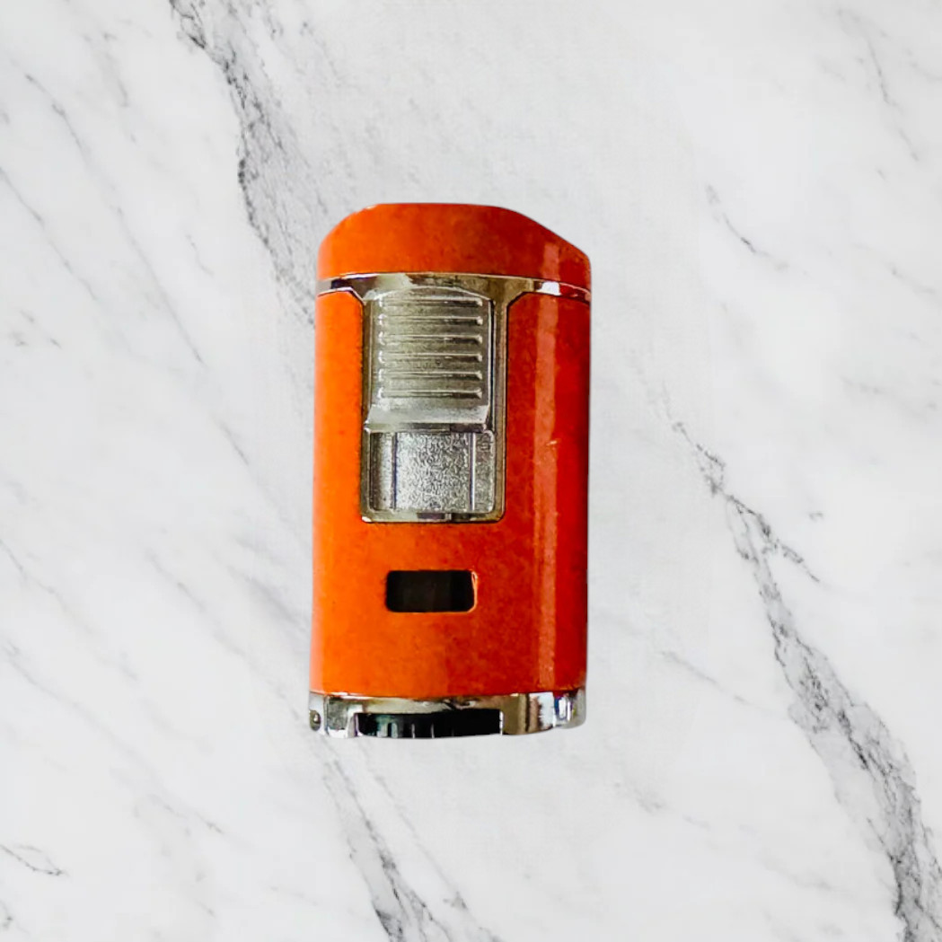 This premium cigar lighter features a sleek metal body, available in three striking colors: Ferrari red, Ferrari yellow, and Hermes orange. The design exudes elegance and durability, perfect for the discerning cigar aficionado. Equipped with four powerful and reliable jet flames, this lighter ensures an even, precise light every time, regardless of wind or conditions.